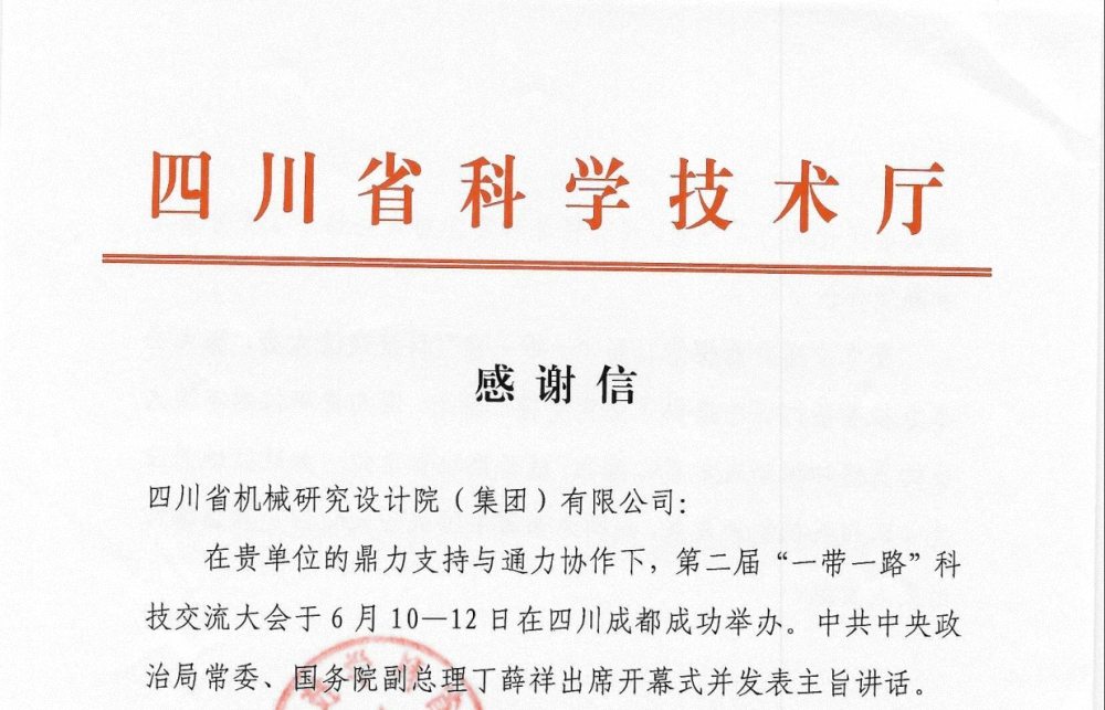 近日,川機集團收到四川省科學技術廳的感謝信。信中對川機集團在第二屆“一帶一路”科技交流大會籌備與舉辦過程中所提供的大力支持與有力保障表示高度認可,并致以誠摯的感...
